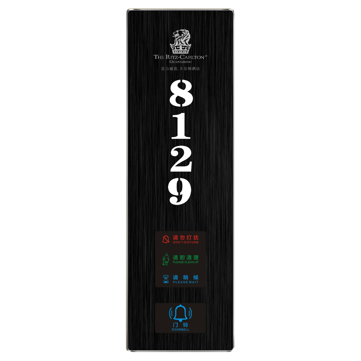 2、客人按下房间内的"请勿打扰”开关,液晶屏的"请勿打扰”图案背光亮起,门外显示屏中提示请不要打扰,此时门铃按键不起作用。